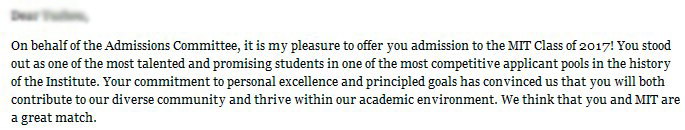 这位同学申请最大的亮点就在于学生本身有很强的学术背景,特别是计算机以及数学方面的造诣,在全国中学生当中屈指可数,而且能在短短时间内考出sat成绩实属不易,在申请过程中尽可能的弱化标准化成绩,着重突出孩子理科计算机方面过人的天赋以及极强的学习能力。这位同学在完成RD的申请后,依然致力于参加各类竞赛活动,当接到麻省理工大学的面试通知时,他正在某大学做演讲。持续的学习热情终于获得了麻省理工大学的青睐。