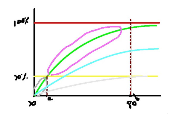 但是到这儿还没完,图中的blue line and gray line是什么意思?他们的出发点跟黄色一样,代表不同的idealistic approach. 图形显示:不是所有的idealistic lines都可以穿越yellow lines,原因不难想到,不是所有人都像故事中的Gann一样那么有热情和行动力。因此我们完整的结论应该是:只有在某些特定条件下,idealistic lines向上穿越practical lines, 这时我们就可以说idealistic app比practical app更有价值, 即: If one is acting, enthusiastic and dedicated to individual interest enough, then idealistic approach could be converted to practical one of much higher original value, in which case idealistic appraoch is much better than practical approach.