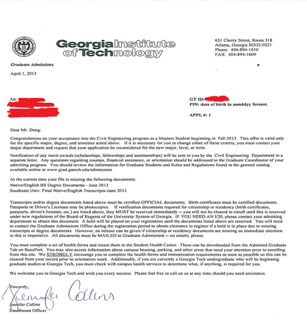 这位同学,本科东南大学,土木工程专业,总GPA 3.532 / 4.8, 专业GPA 3.788 / 4.8,TOEFL IBT 104, GRE 323, 共申请8所美国top30学校的土木工程研究生项目,其中7所拿到offer,包括康奈尔大学,佐治亚理工大学,西北大学,卡耐基梅陇大学等名校,以下附学生最终选择就读的佐治亚理工大学的offer。