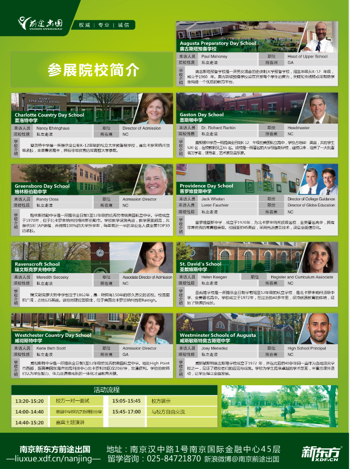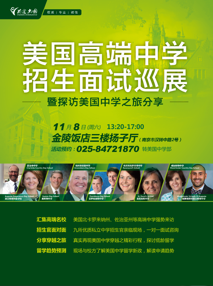 新东方前途出国将于11月8日举办“美国顶尖走读学校面试会”,当天下午13:00点开始在新街口金陵饭店扬子厅举行。届时将有美国北卡州和佐治亚州的顶尖走读学校到访,为准备申请明年入学的孩子一个现场面试的机会,同时还有新东方美国中学申请指导专家为您分享美国中学探访之旅,以及神秘嘉宾分享青少年在美国中学初长成的故事。如果您的孩子考虑去美国读中学,正想了解美国中学的真实情况,敬请关注此次活动。活动详情请登录新东方前途出国南京公司官网或致电025-84721870