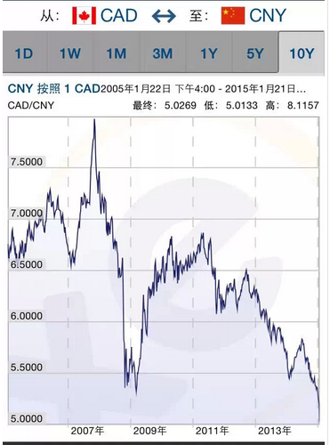 2007年加币汇率曾经一度超过7.5,靠近8.0;