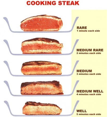 千万记得well-done在牛排馆可不是干得好的意思哦!根据火候不同,牛排的吃法从全生一直到全熟都有,不同火候的特征和术语如下。