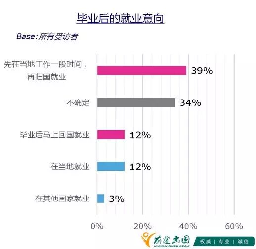 多数有留学意向的学生尚无移民计划。对于毕业后的去向,有51%的学生表示会选择回国就业。这与教育部公布的2014年度留学回国人数的变化趋势不谋而合,2014年度,各类留学回国人员总数为36.48万人。与2013年相比,留学回国人数增加1.13万人,增长了3.20%。