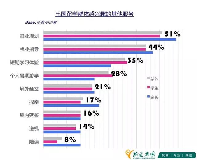 留学人群不光在选择专业时表现出了对就业的重视,他们对留学服务也提出了新的需求。除了常规留学申请外,职业规划类的服务更能引起留学人群的兴趣,家长们尤其重视就业指导类的服务。