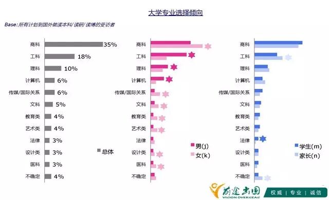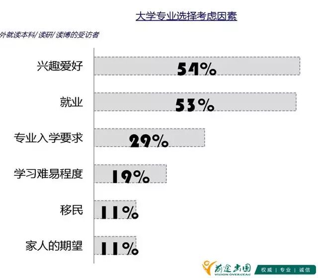 调查中比较出乎意料的是,留学人群在专业的选择上非常理智,家人的期望不再成为他们选专业时的重点考虑因素,取而代之的是自己的兴趣爱好和未来的就业率。尤其是就业因素,已经排到了第二名的位置。