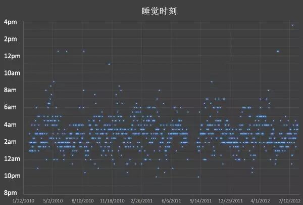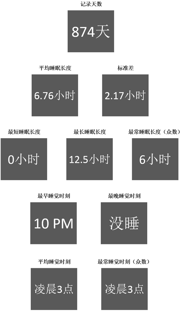 作为一个爱好统计数据的人,我从2010年开始记录我每天的睡眠时间,包括几点睡的觉、睡了多久,和之后补睡了多久。统计了两年半,从2010年2月12日到2012年8月6日,除中间部分时间回国没有统计以外,一共有874天的记录。
