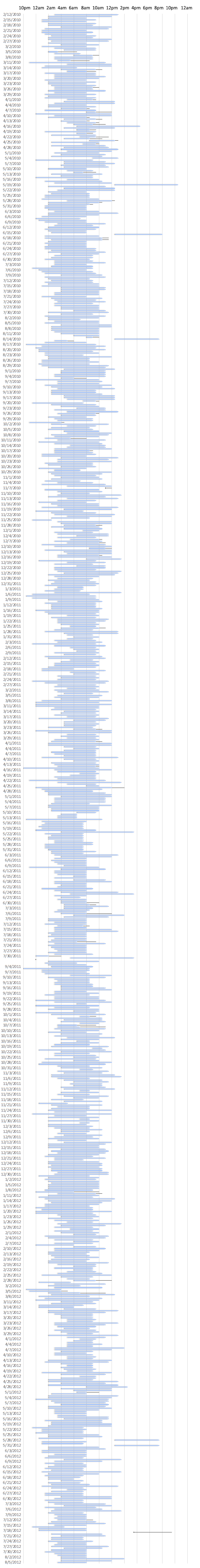 下面这幅图记录了整个两年的时间段中,每一天的睡觉时刻和长度。其中蓝线代表长度,黑色的细点代表后来补觉的时间长度(通常是下午没课的时候补),每一列代表两个小时。炒股的同学应该能认出来这是一幅竖着的股市K线图。