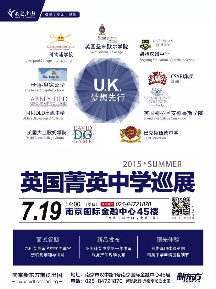 想要去英国菁英中学的童鞋们注意啦!7月19日(周日)英国菁英中学展要来南京啦!提前预约,现场签到后送留学大礼包!