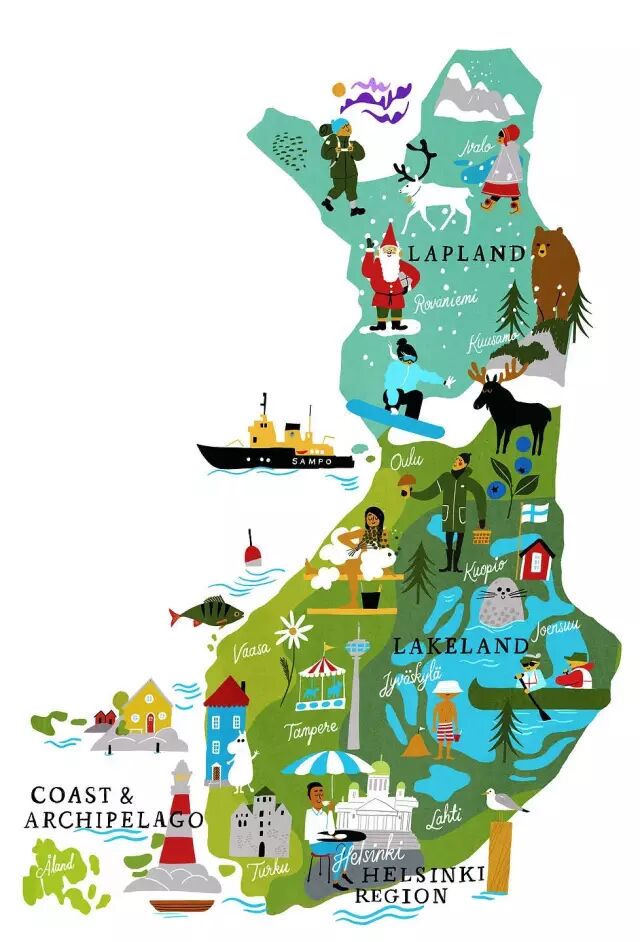 芬兰有四个极有特色的地区——赫尔辛基、群岛、湖区和拉普兰。这四个地区各有其独特的文化根源。