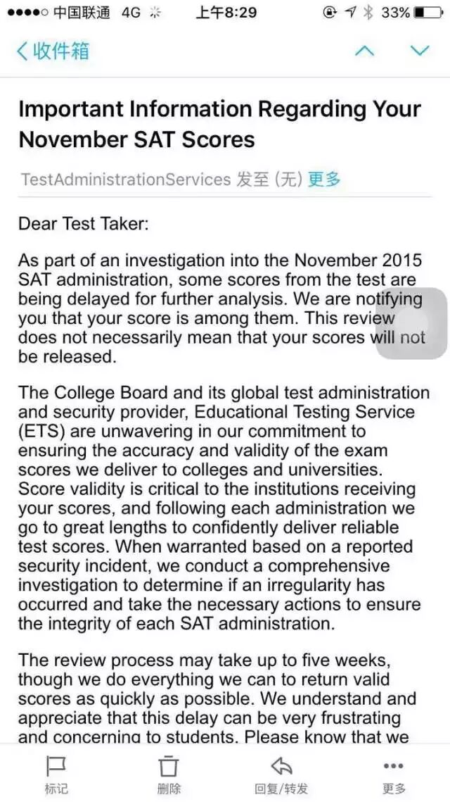 美国大学理事会通知,考试成绩将出现delay,于5周后公布结果,此邮件措辞正式,表示会全面调查,而非去年的"administrative review",但邮件同时表示,收到此封邮件的学生并不意味着就不会出分,因此学生无需过度焦虑。
