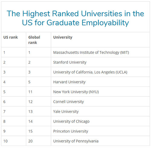 麻省理工学院在QS 2020世界大学就业力排名第1位,在美国同样排名第1。正如预期的那样,麻省理工学院在所有毕业生就业能力指标中得分都很高,在雇主声誉和校友成果方面得分最高。该大学拥有全球教育和职业发展中心,该中心不仅可以支持学生的职业发展,还可以为出国工作或学习提供建议。