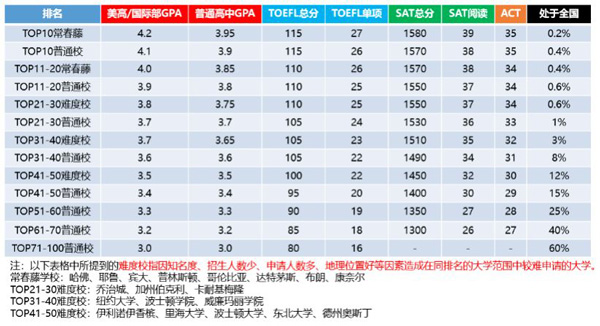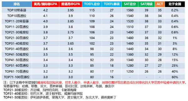 美国大学的招生原则向来以择优录取为原则,例如常春藤大学的招生对象是中国学生中最优秀的前4‰(千分之四),TOP30大学的招生对象是最优秀的前1%,TOP50大学的招生对象是最优秀的前15%,TOP100大学是最优秀的60%。