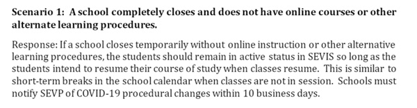 :如果学校暂时性关闭且不提供线上课或者其他类型的学习方式,学生仍然可以保持SEVIS激活状态 只要学校恢复课程学习,该种情况类似于学校在学期中没课放假一样。学校需要在10个工作日内通告SEVP。