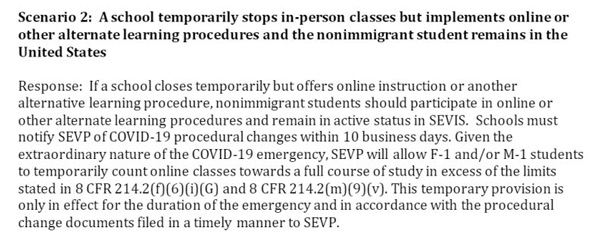 :如果学校暂时性关闭但是提供线上指导或者其他学习方式,留学生应该参加线上课程或其他学习方式以保证SEVIS处于激活状态。学校需要在10个工作日内通知SEVP新冠疫情的程序调整。考虑到新冠疫情的特殊性,SEVP将会允许持有F1或M1签证的学生暂时性地将线上课程计入完整的学业当中,且可以超过原本规定的时长。同时也允许学生离开美国在其他地方参加线上课程。