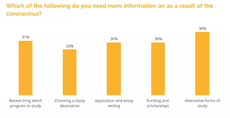学生更希望海外高校能够提供针对疫情开展的多种学习方式,这个比例占据36%;余下64%的期望了解信息都与留学申请相关,且比例相对平均(均在30%上下),这些信息包括:专业选择、学费及奖学金项目、申请及文书、选择留学目的地。