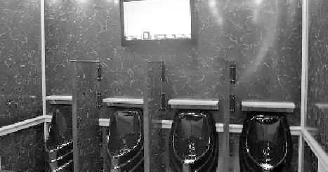该厕所采用豪华的黑色大理石墙壁,里头除了空调还有音响系统,上厕所还有音乐可听,在厕所外排队的人也不会无聊,他们可以通过安装在外墙上的37英寸平板电视收看就职典礼实况转播。