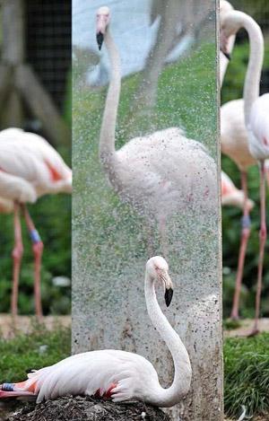 一只火烈鸟卧在巢上,后面是管理人员竖起的镜子