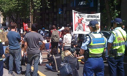 在中午12点30分,抗议者游行到了柯林斯街,阻碍着交通,然后继续向威廉街(William Street)前进,后来在澳新银行(ANZ Bank)外的马路边坐下。
