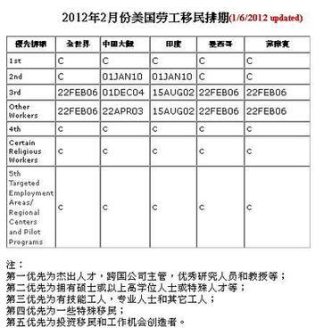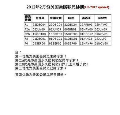 2012年1月6日,美国国务院公布了2012年2月最新的移民签证排期。