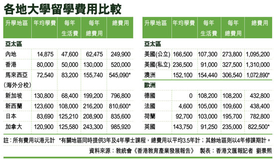 教统会辖下“发展香港教育产业工作小组”发表的《香港教育产业发展报告》,比较非本地生于世界多个主要国家及地区完成大学学位的平均费用,包括学费及生活费。其中以美国最高,公立及私立大学分别为109.5万元及131万元,澳洲则以107.3万元紧随其后。另外,日本及新加坡的留学费用,分别为83.6万元及79.7万元,近年引入不少海外大学设分校的马来西亚,也需54.5万元,全部均较在港录取梦校的52万元花费高。综合全亚太区,只得内地的有关开支(25万元)比香港少。