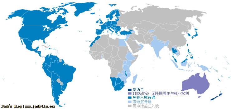 持有新西兰护照所享有通行权利的国家和地区示意图