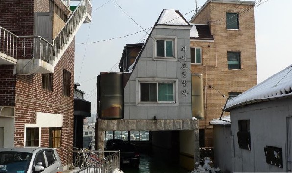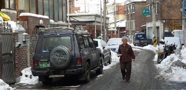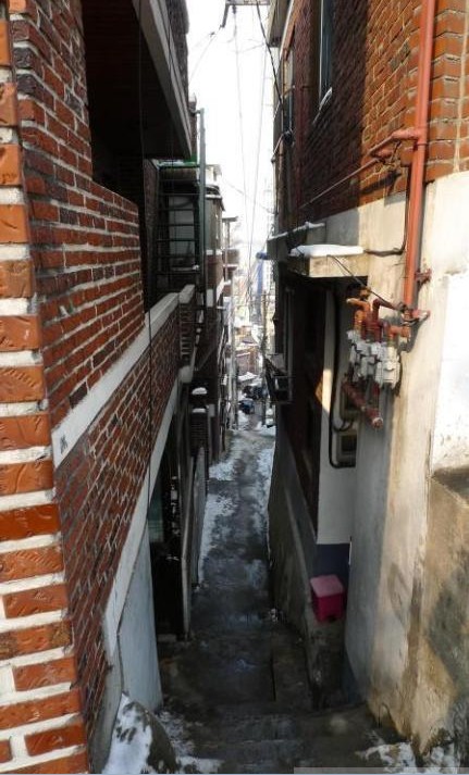 在汉城的市内,就有不少建在山坡上的蜗居。由于人多地少,房屋建筑非常密集,有些房子终年不见阳光。这么窄的过道,胖点的恐怕过不去。