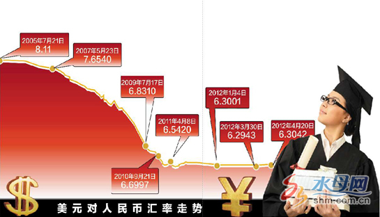 某留学机构负责人告诉记者,以留国为例,美国读研究生一年的费用一般需要30多万元,2005年7月美元对人民币交易价格为1美元兑8.11元人民币,今年4月20日1美元兑人民币6.3042元。以学费不变估算,7年前读研究生所需要的人民币约38.6万元,比现在增加8万多元。