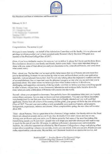 这位同学很早就有较好的标准化成绩,提前批次申请时没有申请ED的学校,只EA申请了芝加哥大学。但没想到今年申请形势非常严峻,芝加哥提前批次出结果的时候,把这位同学放在了等待名单中。家长和孩子非常焦虑,并多次来公司与文书老师沟通,决定ED2申请 POMONA COLLEGE。确定好学校后,外籍文书老师与前期顾问老师全力配合,最终收获了满意的OFFER。