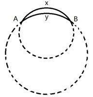 A、B两点间,显然是曲线y更短,而越短的曲线,其延长而形成的圆更大。因此,地球上两点最近的曲线,应是能在球体上切出最大的圆的曲线(也就是所谓的测地线Geodesic)。大家拿个地球仪切切看,就不难发现因为中美都在北半球,所以最短的曲线是要往北绕的!