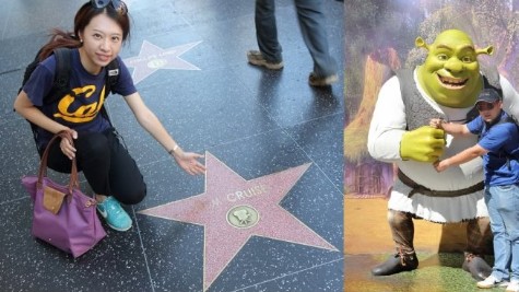 今天天气格外炎热,而好莱坞星光大道仍然游人如织,路过李小龙和成龙的地砖,我招呼紫薇拍照,却发现她早已经蹲在了Tom Cruise的旁边。好莱坞大道上不时看到打扮成玛丽莲梦露、猫女的身材高挑的美女,可是唯嘉却兴奋地跑到绿油油的Shrek旁边摆起Pose……