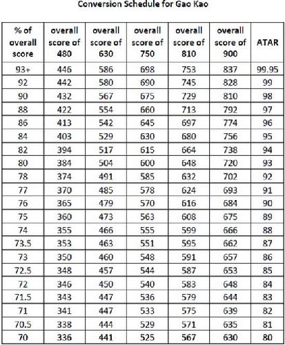 有意去澳洲国立大学读本科的同学请参考以下表格,表格内的分数是将高考成绩转化为澳洲ATAR (Australian Tertiary Admission Rank – ie. Australian Year 12)。