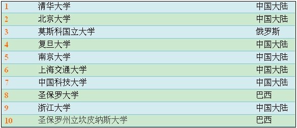以下为金砖5国最佳大学排行榜前10名,清华大学、北京大学、莫斯科国立大学(Lomonosov Moscow State University)、复旦大学、南京大学、上海交通大学、中国科学技术大学、巴西圣保罗大学(Universidade de Sao Paulo )、浙江大学、巴西金边大学(Universidade Estadual de Campinas)。