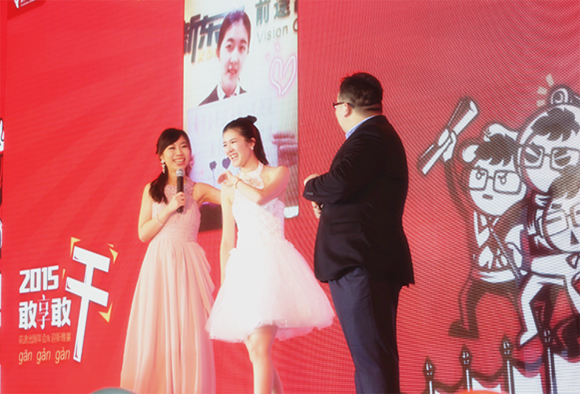 年会首次展开前期预热互动活动,向北京前途全体员工征集年会梦想。在众多梦想中,“希望俞老师给题词祝我新婚幸福”高票当选,在年会现场这位幸运的少女美梦成真,获得了俞老师的视频祝福和亲笔赠书,流下了感动的泪水。