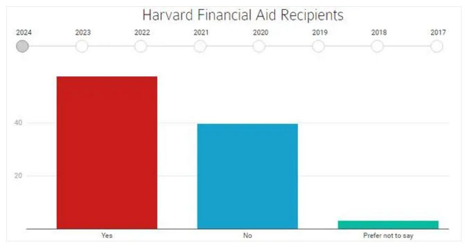 父母中有一人或多人读过哈佛大学的学生,其父母收入水平平均高于家里没有哈佛校友的学生。校友子女新生中有32.58%的家庭收入达到50万美元以上(即美国人定义的“富豪家庭”门槛),其实这已经算低的了,毕竟还有29.55%的不愿透漏。