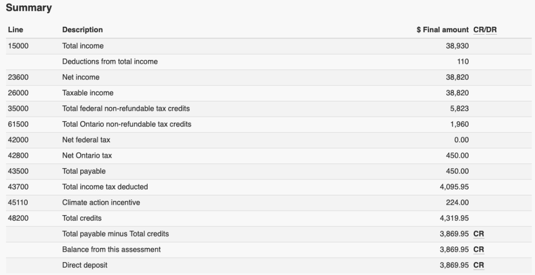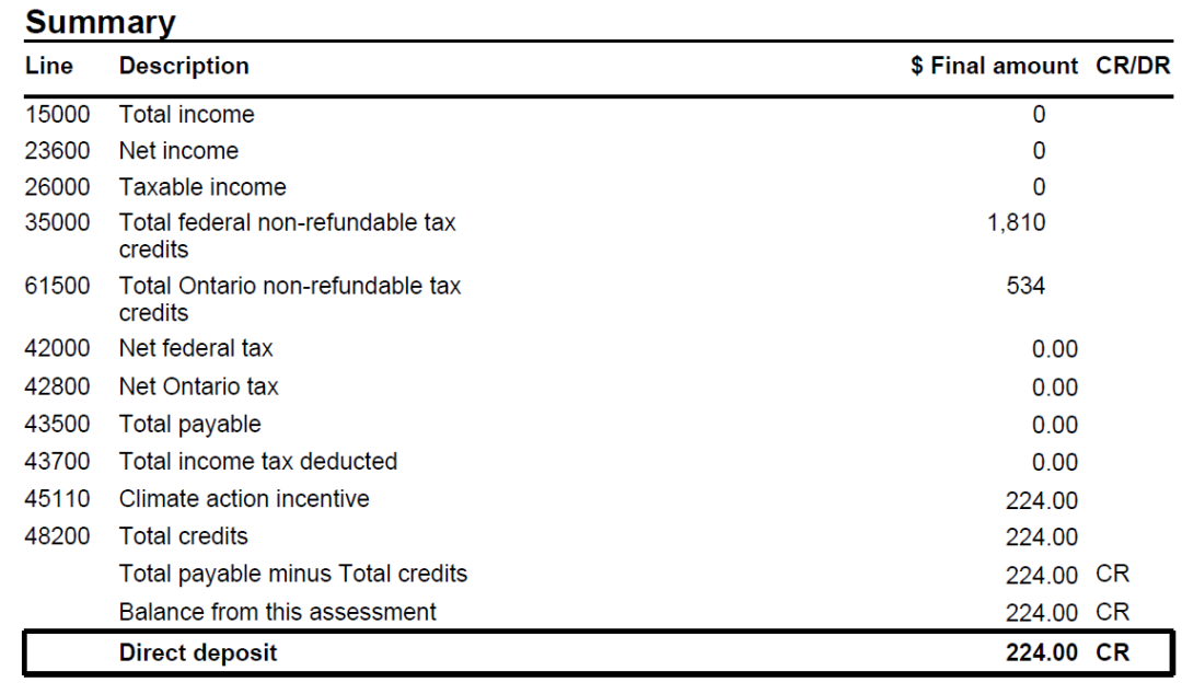 下图为零收入,零抵扣的退税,该退税224加币为安省的碳税,是所有安省居民都可以拿到的。