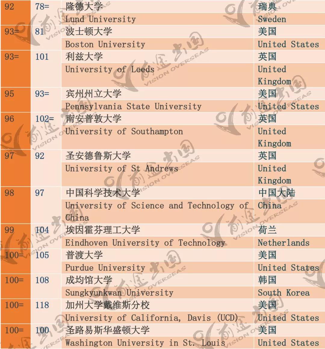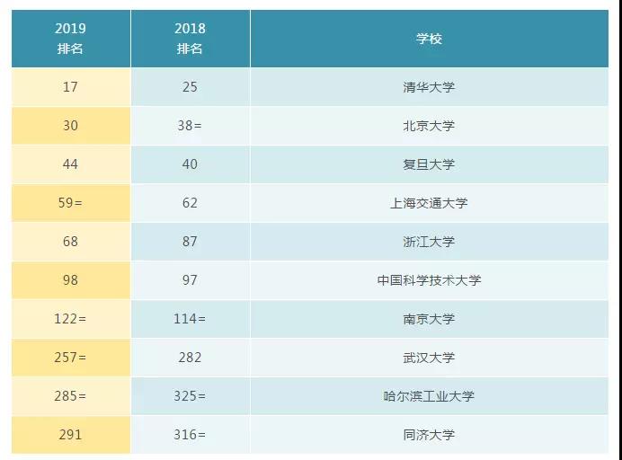 TOP100的院校中,中国大陆有6所,分别是清华、北大、复旦、上交、浙大、中科大。第七到第十分别是南大、武大、哈工大、同济。其中哈工大去年意外掉出前300,今年重回前三百并创下QS榜单历史新高285名。