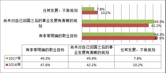 2017年,在职业规划方面,46.3%的海归有非常明确的职业目标,45.9%的海归尚未无清晰规划。7.8%的海归选择“任其发展,不做规划”。