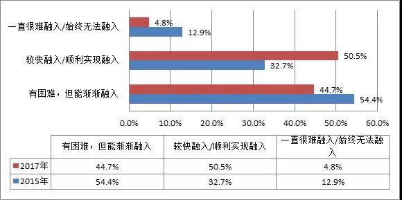 海归回国之后,50.5%的海归能顺利融入国内生活与工作,认为虽有困难,但能逐渐克服占比44.7%。此外,4.8%的海归表示回国后始终无法完全融入。与2015年的调查结果(一直很难融入的占12.9%)相比,海归融入国内环境的情况明显好转。