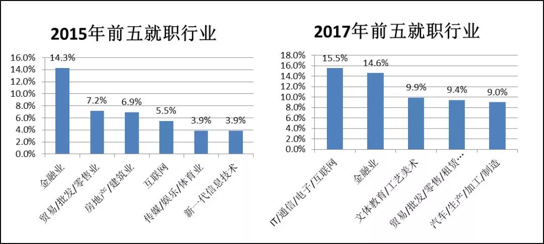调查显示,2017年位居海归就职行业前五名的依次为IT/通信/电子/互联网、金融业、文体教育/工艺美术、贸易/批发/零售/租赁业/快速消费品/耐用消费品、汽车/生产/加工/制造。与2015年相比,IT/通信/电子/互联网行业就业人数超过金融业,从第四位升至第一位,增长10个百分点,反映出近几年我国IT/通信/电子/互联网行业的快速发展。