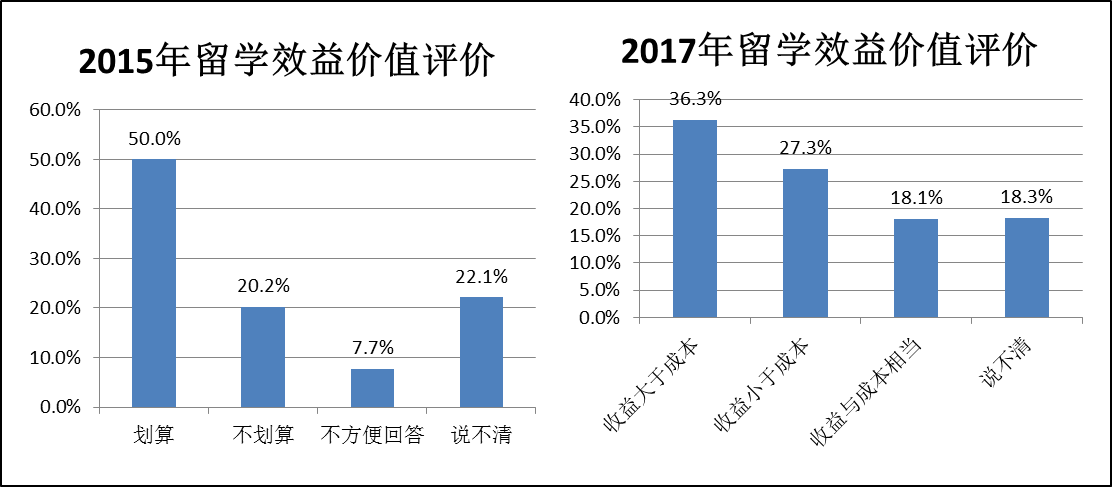 调查发现,海归群体对留学效益价值持肯定态度。认为收益大于成本的占36.3%,认为收益成本相当的占18.1%,认为收益小于成本的占27.3%,说不清的占18.3%。