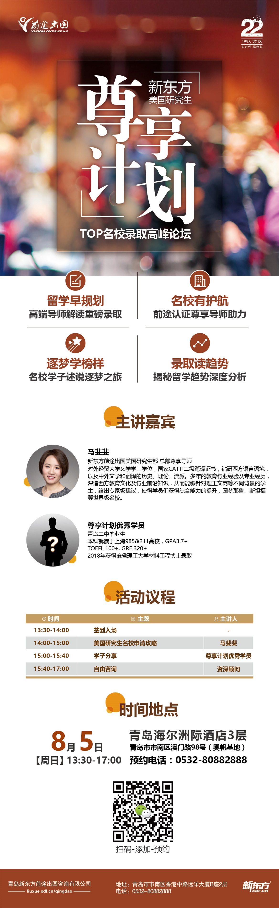 想要了解更多关于美国研究生申请的知识,欢迎参加青岛新东方前途出国于8月5日举办的美国研究生申请交流讲座!