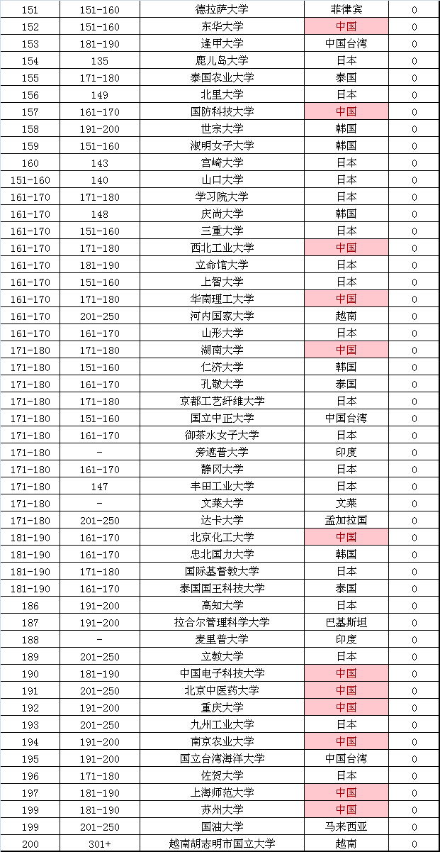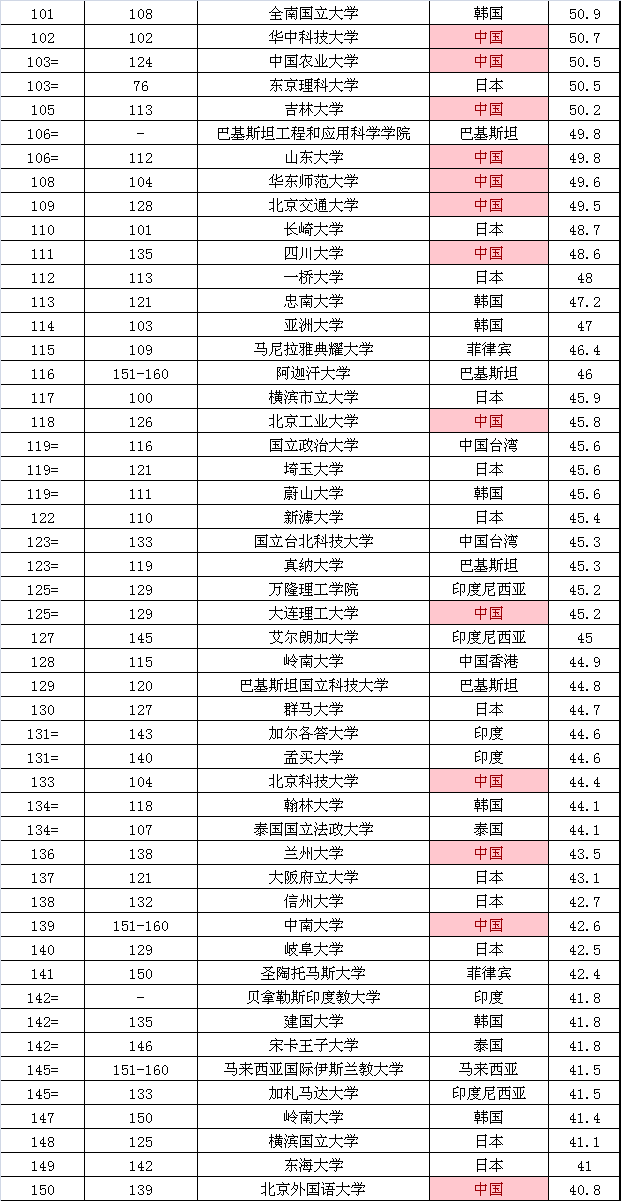 统计发现,总计110所中国大学进入亚洲大学300强,再创历史新高,入选大学数量居亚洲国家榜首。其中,中国大陆74所,中国台湾28所,中国香港7所,中国澳门1所。日本和韩国位列二三位,日本有68所,韩国45所。