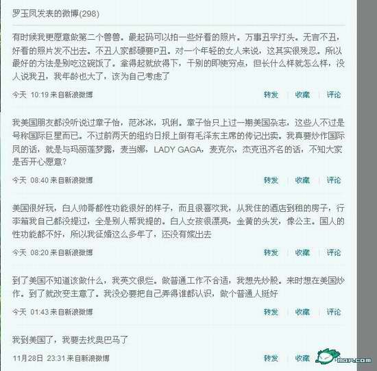 罗玉凤时常在微博中发表一些雷人言论。其中在8月17日,罗玉凤在认证微博中发了一句:“我要一把火烧了美国移民局。”但是根据美国的思维习惯,认为凤姐对美国有安全威胁,也许会将凤姐遣返回国。小编提醒大家,出过留学或者工作,一定要注意当地的生活习惯,避免类似凤姐的事件发生。