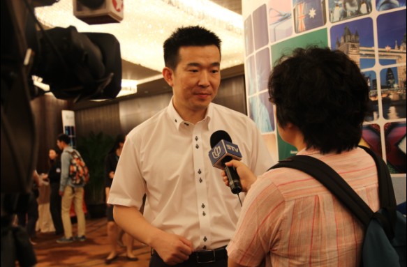 前途出国总经理在接受东方卫视的电视采访,媒体对于名校化高端化的现状也非常关注