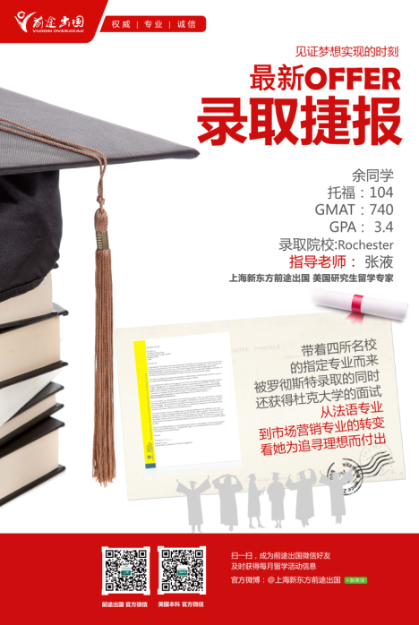 既然有方向,对于张老师来说,他还是愿意帮助这位同学冲刺这几所名校的,接下来,就是增加申请硬件,张老师跟这位同学说要想直接冲刺名校,那一定要在语言成绩上加油,要重新冲刺一下GMAT,这位同学的配合度也非常高,在第二次的成绩出来后,整个申请过程非常顺利,前途出国美国研究生文书曹老师也根据学生的意愿及实习经历,完成了一篇打动招生官的申请文书,在刚刚过去的几天里,这位同学获得了Rochester University 的市场营销,同时,张液老师还获得了一个更好的消息,冲刺的另外一个名校杜克大学也发出了面试邀请,意味着,1月份还会有更好的成绩出来。