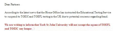 目前英国绝大部分院校都没有明确表示不再接受托福成绩,极个别院校发通知强烈建议学生考取雅思成绩进行院校和签证的申请,如York St John University(约克圣约翰大学),Anglia Ruskin University(安格利亚鲁斯鲁斯金大学), University of Strathclyde(斯凯莱德大学)。