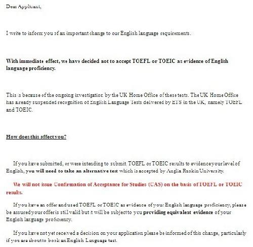 2. 受到影响的学生是目前已经在英国本土提交新的签证申请或者续签的学生,这类学生不能使用托福或者托业成绩作为语言水平的证明;已经提交申请的学生,将被建议参加其他UKBA(英国边境署)认可的英语水平测试,例如雅思,PTE等,同时他们的签证申请会被暂缓处理。