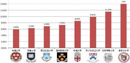 2014年美国大学招生工作已经基本结束,各所大学也陆续公布了自己的招生录取数据。根据美国常春藤盟校公布的录取数据显示,在25万3472名申请者中,仅有2万2624人被录取,录取率大约为8.925%。