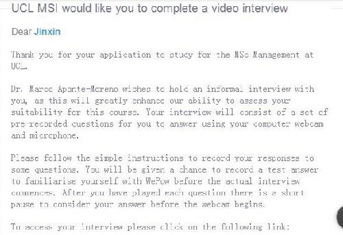 UCL 的很多专业是需要面试的, 今年采取的是视频面试,主要是导师想跟学生进行一个非正式的沟通,对学生能否拿到录取很重要。当时学生在境外旅游,我们立即跟学生通过微信群沟通此事。申请老师跟校方确认好时间,学生尝试着熟悉视频面试环节。其中,最最让我们紧张的是对方会跟学生聊哪些问题。后来通过网上搜索找到以下题目,现在贴出来分享给大家: 文书老师针对这些题目给学生一些建议,并告知其一些面试注意事项,学生在酒店里很自信地完成了跟导师的愉快沟通。