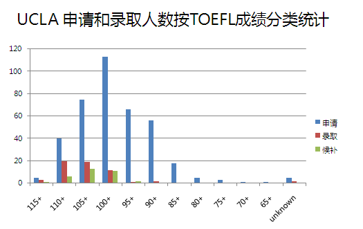 图表说明:这张图展示的是新东方前途出国2014年秋所有申请UCLA的学生的托福分数情况。蓝色表示申请的学生,红色表示录取的学生,绿色表示候补的学生。可以清楚的看到,托福低于90分尤其是85分以下录取的几率就变得很小。近两年我的学生申请UCLA的情况是,低于95分就没有录取的,所以上图中85分以下能够进入UCLA的不排除部分加州本这位学生。